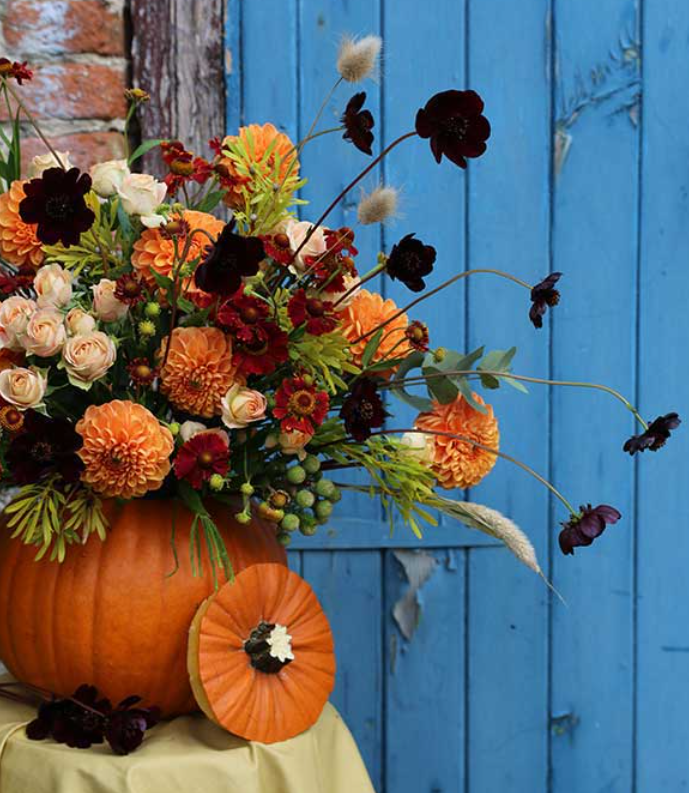 “Bloomin Pumpkin” — A pumpkin-vessel filled with seasonal blooms: imagine orange roses, yellow sunflowers, dark foliage.